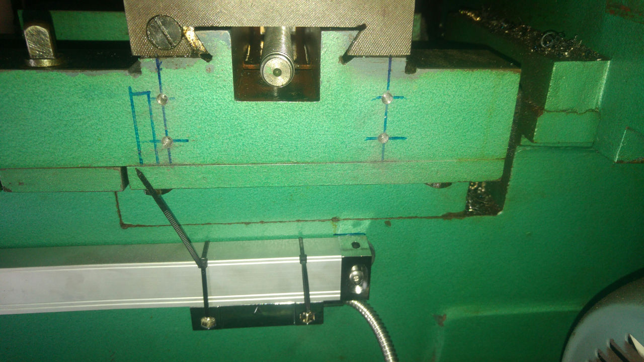 The cross slide read head attaches to the saddle, while the scale attaches to the cross slide. The CQ6230 uses tapered wedge gibbs, so the side of the cross slide only has the mostly unused locking grubscrew. The cable ties holding the read head to the scale were replace with slightly looser ones and the read head was moved along the scale to allow the assembly to be tested in several positions. Once an optimal location was determined - taking into account dovetails, gibb adjustment, material thickness, casting draught, etc - the cable ties were replaced with a small clamp and the positions of the scale mounting holes were marked. Packing out the read head was necessary, as the mounting surface on the saddle is recessed toward the headstock relative to the crosslide face. The saddle was moved to the end of the bed, with the tailstock removed, and the holes were drilled and tapped M5.